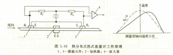 图3.68所示为热分布式流量计工作原理。流量传感器由细长的测量管和绕在其外壁上的加热器及感温元件组成,加热器线圈布置在测量管的中央,它将管壁和管内的流体加热,在加热线圈两边对称位置绕有两个感温热电阻R